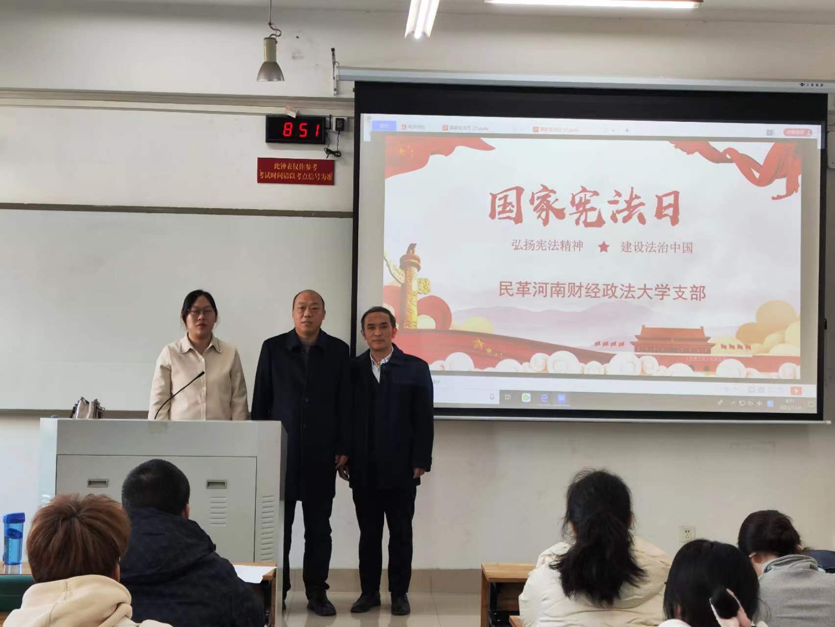 12月4日,是我国的第十个国家宪法日,为弘扬宪法精神,增强宪法意识,促进依宪治国和全面依法治国,公司纪检监察专业本科班邀请民革谈球吧登录入口支部走进大学课堂,给纪检监察专业本科生举办了宪法相关知识讲座。讲座采用座谈形式,由任课教师庞慧洁博士、支部主委刘用军教授、支部党员张英豪博士与员工展开共同交流。庞慧洁博士介绍了国家宪法日的由来和意义,刘用军教授讲解了宪法日对于强化由上至下树立宪法意识的重要性,张英豪博士通过案例阐释了宪法中的平等性要求。多名员工针对以上发言阐述了自己的看法,并上台与大家互动。本次宪法日活动是民革支部服务社会职能的展现,通过这样的活动,进一步增强了同学们对宪法的理解,对于弘扬宪法精神,加强宪法理论研究,使青年员工带头成为宪法的忠实崇尚者、自觉遵守者、坚定捍卫者,具有重要意义。